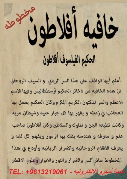 خافيه الحكيم الفيلسوف افلاطون اسرار الزايرجه الزيرجه اعلم ايها الواقف على هذا السر الرباني والسيف الروحاني ان هذه الخافيه من ذخائر الحكيم ارسطاطاليس وفيها الاسم الاعظم والسر المكنون الكريم المكرم وكان الحكيم يعمل بها العجائب في زمانه ويقهر بها كل جبار عنيد وشيطان مريد وكانت تطيعه الجن والملوك والسلاطين وكان افلاطون صاحب علم ومعرفه وهندسه يفك بها الرموز ويفهم كل لغه ويعرف الاقلام الروحانيه والاسرار الربانيه واودع في هذا المخطوط سائر السر والاسرار والنور والانوار وعلوم الاقطار واعلم ان هذه الخافيه كانت منقوشه بالقلم اليوناني القديم بالياقوت وماء الذهب في لوح من الزبرجد الاخضر اعلم ايها الواقف على هذا الكتاب ان من اراد ان يبلغ المنى والمراد والمطلق ويشهد المنظر وتذهب عنه الهموم وتنجلي عنه الغموم والكروب ويفهم ويعلم ما لم يكن يغلم فليدخل في هذا الكتاب الذي اودع فيه سر الاسرار والعلوم القديمه واسرار الكون وما خفا ومن هنا نبداء بالخطاب والله الهادي للغيوب والموفق للصواب
